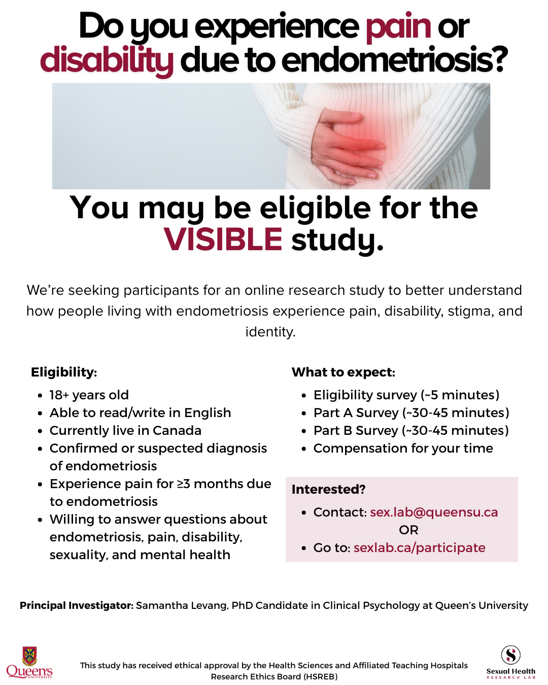 The purpose of the VISIBLE Study is to learn more about how people living with endometriosis experience pain, disability, stigma, and identity.
